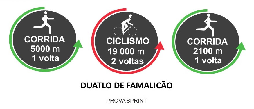 Corrida 5000 metros (1 volta) - Ciclismo 19000 m (2 voltas) - 2100 m (1 volta).